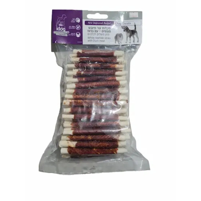 איידוג מציע מארז מקלונים לבנים בליפוף ברווז בגודל 5 אינץ ומשקל כולל של 1 קילוגרם. המקלונים עשויים מעור לבן איכותי ומעוטרים בטעימה של חטיף ברווז, מה שהופך אותם למתאימים לכלבים מכל הגדלים – מקטן ועד גדול!