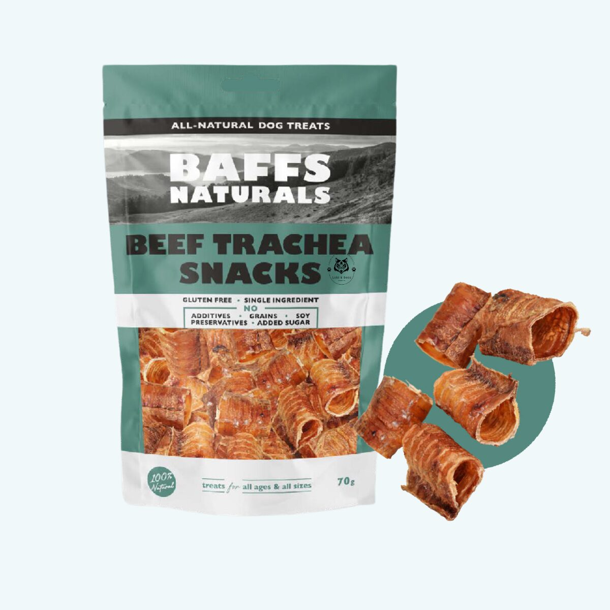 **תיאור המוצר:** חטיף וושט בקר ארוך וטבעי מבית Baffs Naturals. החטיף מורכב מ-100% רכיבים טבעיים.