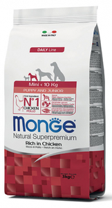 Monge Mini Puppy & Junior עם עוף הוא מזון מגזע קטן לגורי כלבים עד משקל 10 ק"ג, פותח במיוחד על ידי מומחי הכלבים של מונג' איטליה. הפורמולה המצוינת היא תוצאה של שנים של פיתוח, מספקת תזונה מלאה ונפלאה לגורים הקטנים והמתוקים. במרכיב עיקרי של עוף, בתוספת פרוביוטיקה לשיפור תהליכי העיכול, המזון נמצא מופחת בדגנים ומועשר באומגה 3 ו-6 לבריאות כללית ופרווה עשירה ונעימה. הוא מכיל גם כרונדרואטין, גלוקוזמין, ארטישוק, שום ואכניצאה. מזון סופר פרימיום לכלבים תוצרת מונג' איטליה.