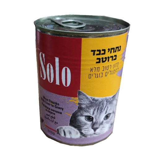 שימורי סולו ברוטב כבד נתחים 410 גרם – מזון רטוב מלא לחתולים בוגרים, המציע טעם עשיר של נתחי כבד ברוטב רך ומפנק.