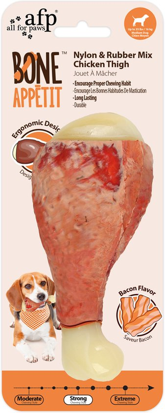 ה-AFP Bone Appetit – ניילון וגומי מיקס עוף ירך – עצם בייקון, עשויה מגומי וניילון יציבים, מגיעה עם ריח וטעם טעימים של בייקון. העצם מצוין במיוחד לכלבים בזכות החומרים החזקים מאוד שבהם, ויכול לעמוד בלועסים הנלהבים ביותר.
