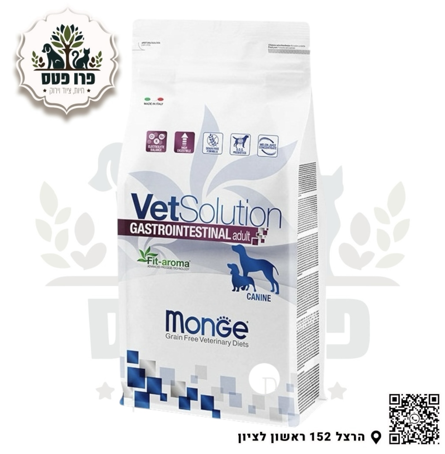 Monge VetSolution Gestrointestinal מכיל סופר אוקסיד Dismutase (SOD) כדי למנוע מתח חמצוני, תמצית ערמונים סוס כדי לקדם בריא, Xylo-oligosaccharides (XOS) כדי להבטיח את המיקרוביוטה של המעיים ואת רמת מוגברת של electolytes ואת החומרים לעיכול מאוד